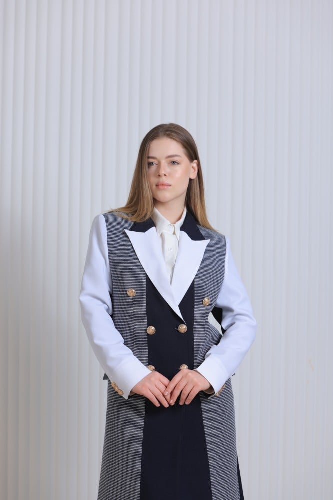 أنيقة بقصة عصرية بقماش الجكار المخطط وقماش الكتان الكحلي وقماش الكتان الاف وايت مبطنة بقماش البونجيه مع خياطة داخلية وجيوب امامية و فتحة من الخلف و كتافات اسفنج وازره ذهبيه