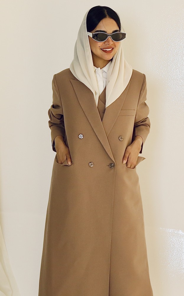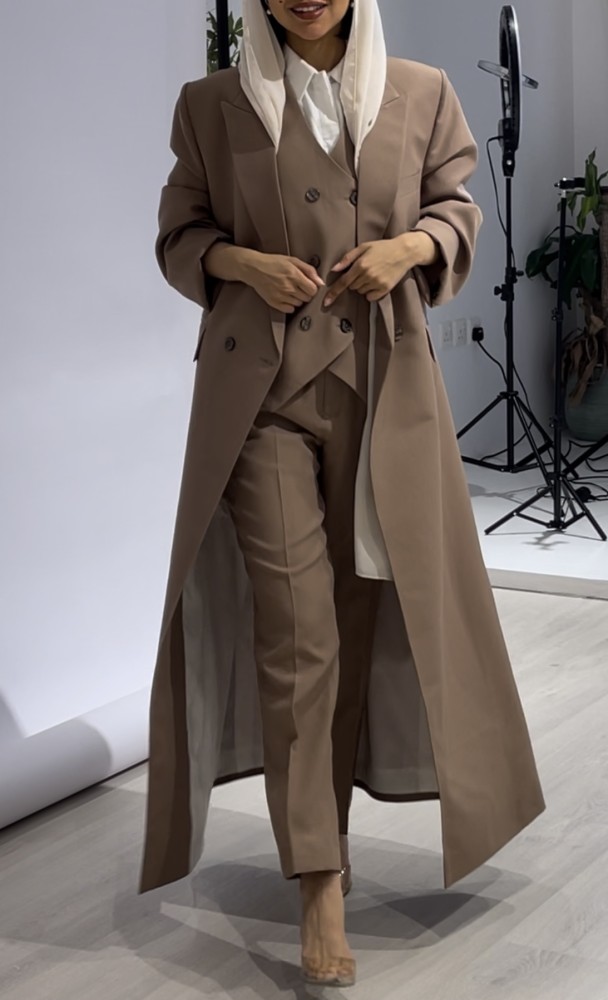 أنيقة بقصة عصرية بقماش الكتان ( خاص لـ علامتنا التجارية )مبطنة بقماش البونجيه مع خياطة داخلية وجيوب امامية و فتحة من الخلف و كتافات اسفنج وازره باللون البني